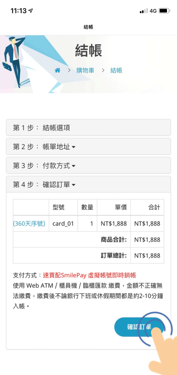 目錄 搜索 展開 360LINE電子名片一、購買流程1.購買序號2.至購物車結帳3.填寫帳單地址 (非必填)4.確認付款方式5.確認訂單6.訂單提交7.匯款完成,啟用序號二、開通、啟用序號流程1.搜尋ID : @360line 加入2.點選註冊/登入3.會員帳號設置三、啟用序號方法(一)方法(二)四、360LINE官方帳號使用說明1.查找名片2.我的名片3.分享我的名片4.編輯名片5.推薦好友6.會員資料 暫無相關搜索結果! 閱讀次數:750 本文檔使用 CLEARONE 發布 5.確認訂單 5.確認訂單作者:Anne 创建时间:2022-06-20 11:14最后编辑:Anne 更新时间:2022-06-21 08:56