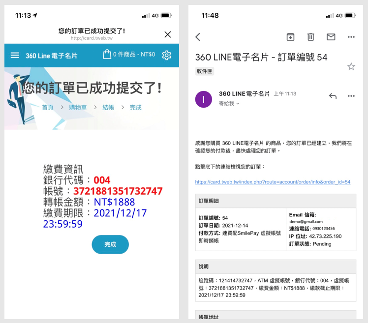 目錄 搜索 展開 360LINE電子名片一、購買流程1.購買序號2.至購物車結帳3.填寫帳單地址 (非必填)4.確認付款方式5.確認訂單6.訂單提交7.匯款完成,啟用序號二、開通、啟用序號流程1.搜尋ID : @360line 加入2.點選註冊/登入3.會員帳號設置三、啟用序號方法(一)方法(二)四、360LINE官方帳號使用說明1.查找名片2.我的名片3.分享我的名片4.編輯名片5.推薦好友6.會員資料 暫無相關搜索結果! 閱讀次數:763 本文檔使用 CLEARONE 發布 6.訂單提交 6.訂單提交請於期限內完成繳費作者:Anne 创建时间:2022-06-20 11:15最后编辑:Anne 更新时间:2022-06-21 08:56