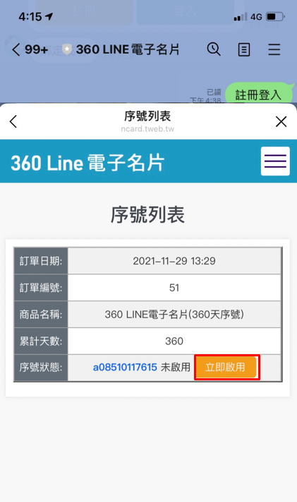 目錄 搜索 展開 360LINE電子名片一、購買流程1.購買序號2.至購物車結帳3.填寫帳單地址 (非必填)4.確認付款方式5.確認訂單6.訂單提交7.匯款完成,啟用序號二、開通、啟用序號流程1.搜尋ID : @360line 加入2.點選註冊/登入3.會員帳號設置三、啟用序號方法(一)方法(二)四、360LINE官方帳號使用說明1.查找名片2.我的名片3.分享我的名片4.編輯名片5.推薦好友6.會員資料 暫無相關搜索結果! 閱讀次數:731 本文檔使用 CLEARONE 發布 方法(一) 三、啟用序號啟用序號 方法(一)a.點選註冊登入,開啟會員資料 b.點擊「我的序號」立即啟用,延長名片分享期限。作者:Anne 创建时间:2022-06-20 13:59最后编辑:Anne 更新时间:2022-06-21 09:01