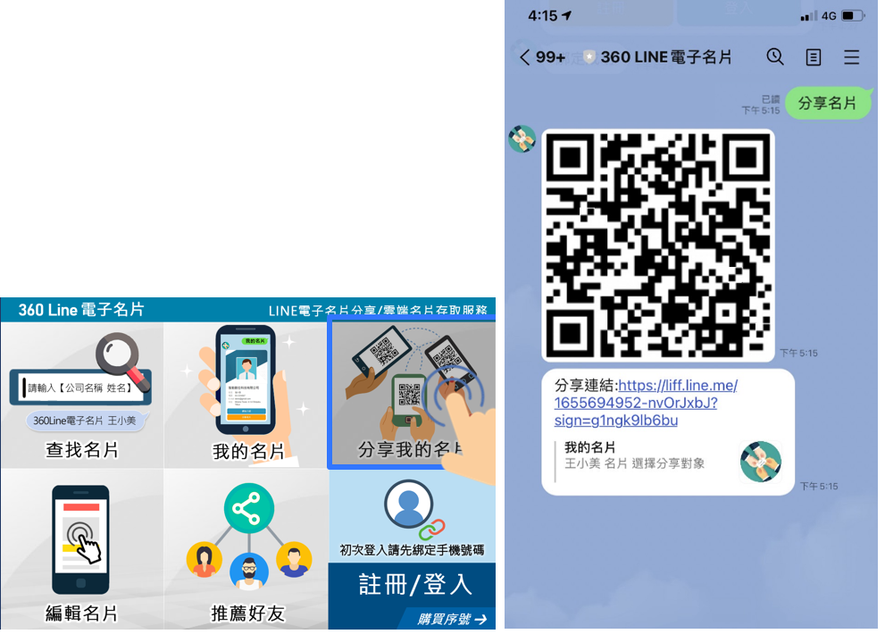 目錄 搜索 展開 360LINE電子名片一、購買流程1.購買序號2.至購物車結帳3.填寫帳單地址 (非必填)4.確認付款方式5.確認訂單6.訂單提交7.匯款完成,啟用序號二、開通、啟用序號流程1.搜尋ID : @360line 加入2.點選註冊/登入3.會員帳號設置三、啟用序號方法(一)方法(二)四、360LINE官方帳號使用說明1.查找名片2.我的名片3.分享我的名片4.編輯名片5.推薦好友6.會員資料 暫無相關搜索結果! 閱讀次數:736 本文檔使用 CLEARONE 發布 3.分享我的名片 3.分享我的名片顯示QR CODE與分享連結,可立即與LINE好友分享名片。作者:Anne 创建时间:2022-06-20 14:32最后编辑:Anne 更新时间:2022-06-21 08:41