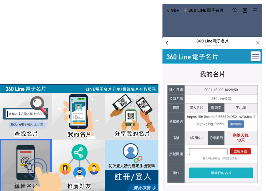 目錄 搜索 展開 360LINE電子名片一、購買流程1.購買序號2.至購物車結帳3.填寫帳單地址 (非必填)4.確認付款方式5.確認訂單6.訂單提交7.匯款完成,啟用序號二、開通、啟用序號流程1.搜尋ID : @360line 加入2.點選註冊/登入3.會員帳號設置三、啟用序號方法(一)方法(二)四、360LINE官方帳號使用說明1.查找名片2.我的名片3.分享我的名片4.編輯名片5.推薦好友6.會員資料 暫無相關搜索結果! 閱讀次數:760 本文檔使用 CLEARONE 發布 4.編輯名片 4.編輯名片我的名片表單中可查看名片詳細資訊。點選「編輯我的名片」開始製作個人專屬名片。作者:Anne 创建时间:2022-06-20 14:34最后编辑:Anne 更新时间:2022-06-21 08:41