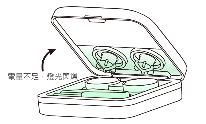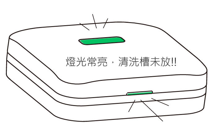 燈光說明● 打開盒蓋時 – 燈光常亮 ● 關閉盒蓋時 – 燈光關閉 (如果燈光常亮,代表清洗槽未放或磁力不足) ● 電量不足時 – 打開盒蓋燈光閃爍,按键後滴滴滴響 ● 充電過程時 – 燈光呼吸顯示 ● 充電完成時 – 燈光熄滅 ● UV殺菌燈 – 啟動清洗後自動照射● 清洗過程 – 燈光亮 3 分鐘,熄燈後輕點按鍵會再亮作者:Anne 创建时间:2022-06-15 09:42最后编辑:Nickey Chen 更新时间:2024-04-23 11:42